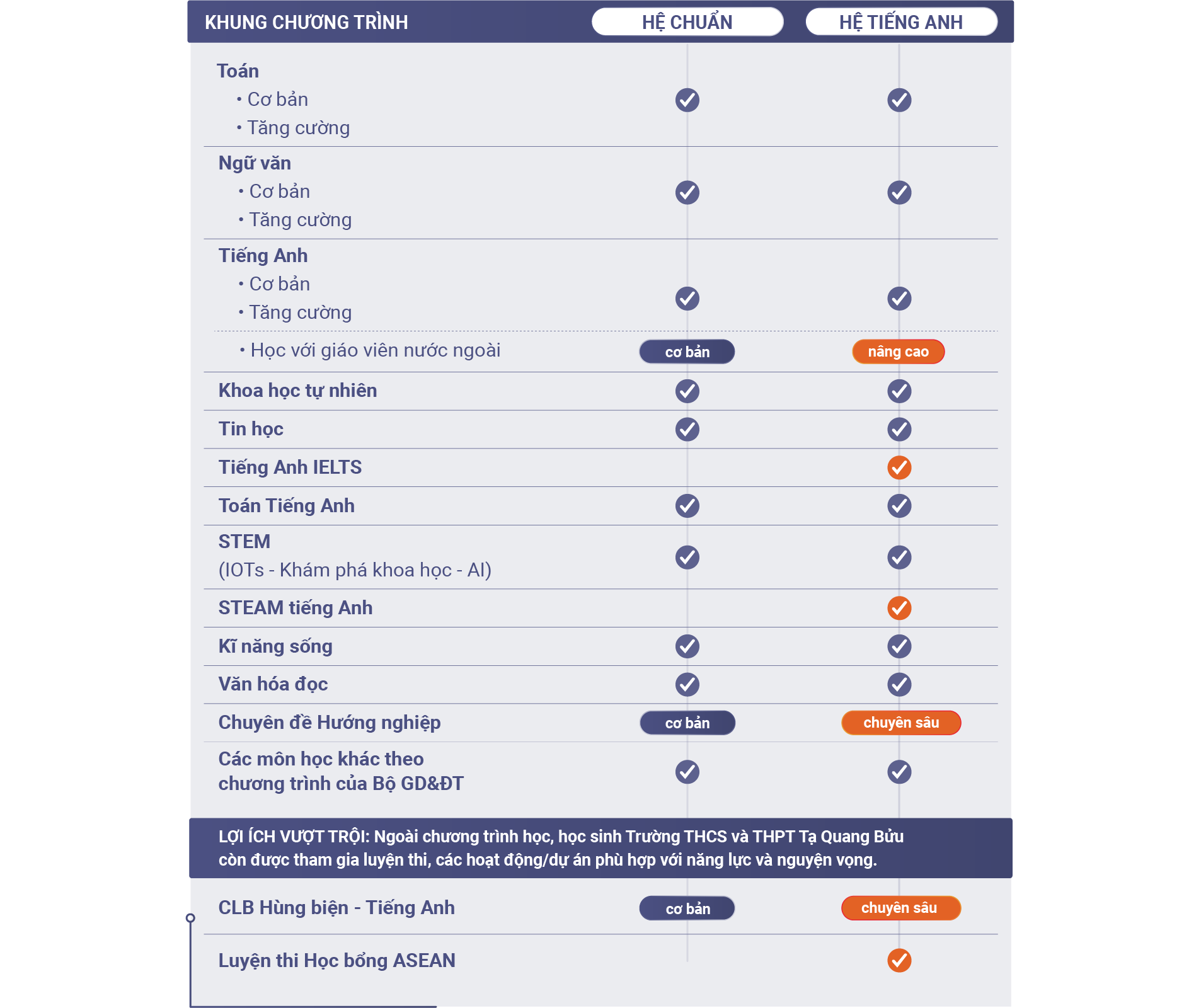 Chương trình được thiết kế dựa trên chương trình chuẩn của Bộ Giáo dục và Đào tạo, với các môn học bổ trợ nhằm phát triển toàn diện cho học sinh.