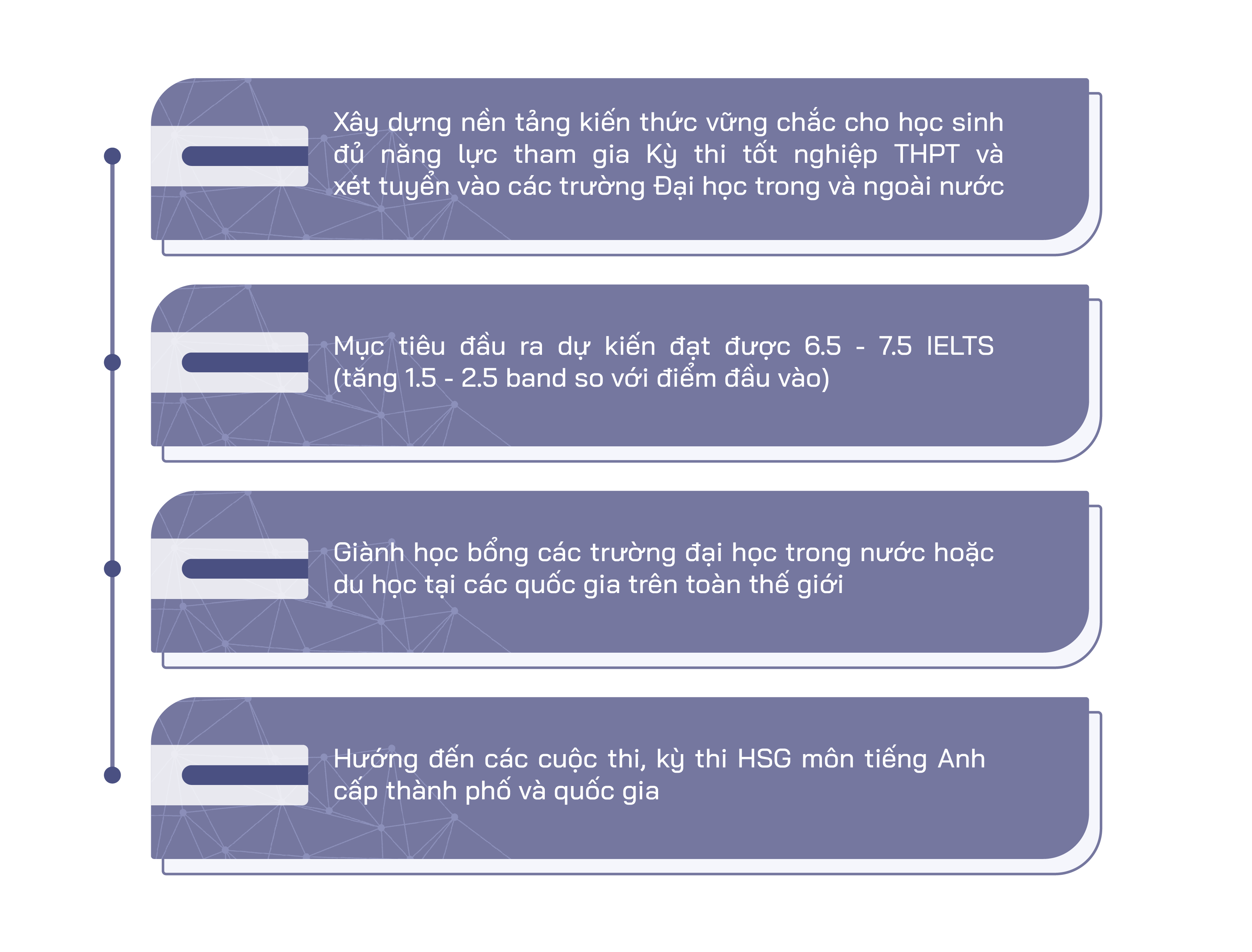 Chương trình tiếng Anh theo định hướng IELTS, giúp học sinh trang bị sớm kiến thức tiếng Anh học thuật, xét tuyển đầu vào các trường đại học.