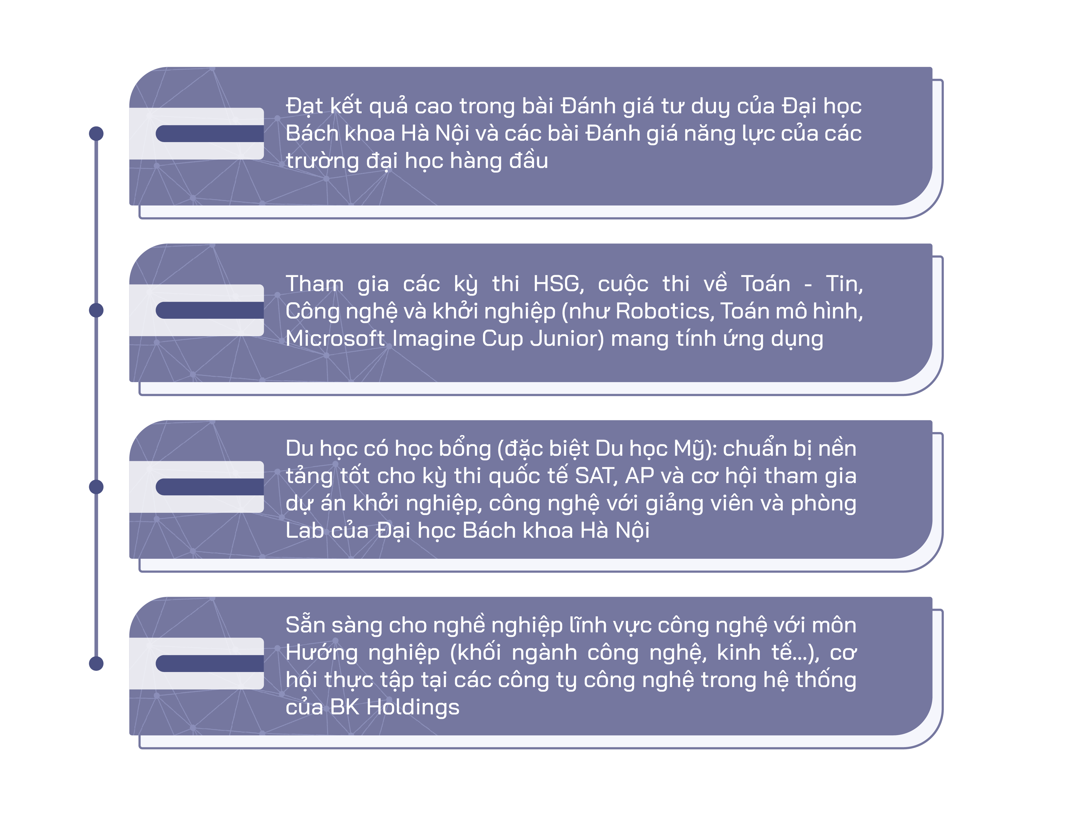 Tích hợp kiến thức tiêu chuẩn của Bộ Giáo dục và Đào tạo cùng các kỹ năng công nghệ ứng dụng; Bám sát xu hướng học tập phát triển tư duy và xây dựng nền tảng kiến thức cho mỗi cá nhân. Định hình mục tiêu và hướng nghiệp cho học sinh trong tương lai.