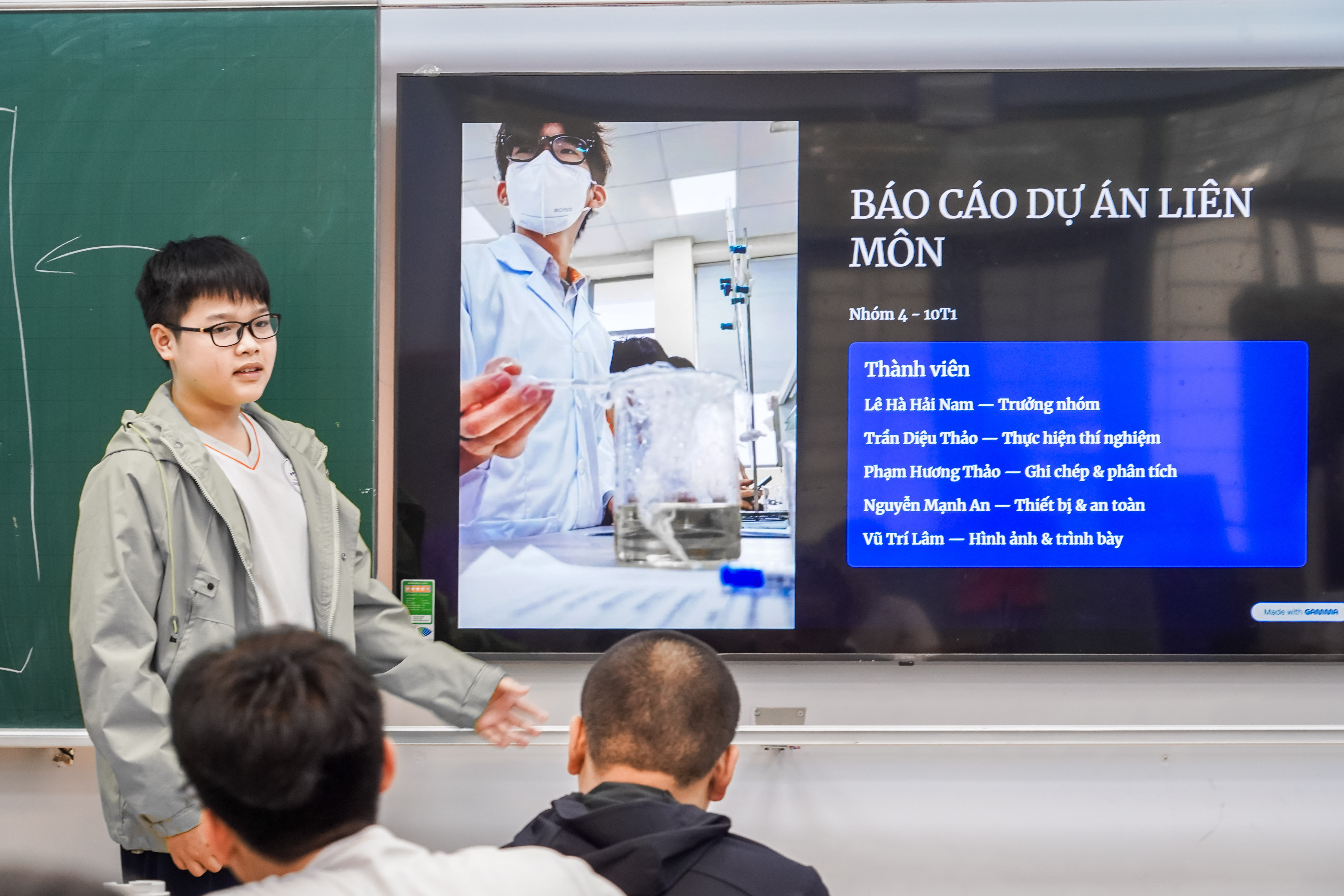 Sau giai đoạn thực hành tại phòng thí nghiệm Trường Hóa và Khoa học sự sống, nơi học sinh trực tiếp tiến hành điện phân dung dịch muối ăn để điều chế nước Javen, khối 10 Hệ Toán - Tin tiếp tục bước vào giai đoạn 3 của Dự án liên môn Khoa học Tự nhiên với hoạt động chia sẻ, thảo luận và điều chỉnh sản phẩm. Nếu giai đoạn trước tập trung vào việc “làm được”, thì giai đoạn này hướng học sinh đi sâu hơn vào việc “hiểu đúng, hiểu đủ và làm tốt hơn”.