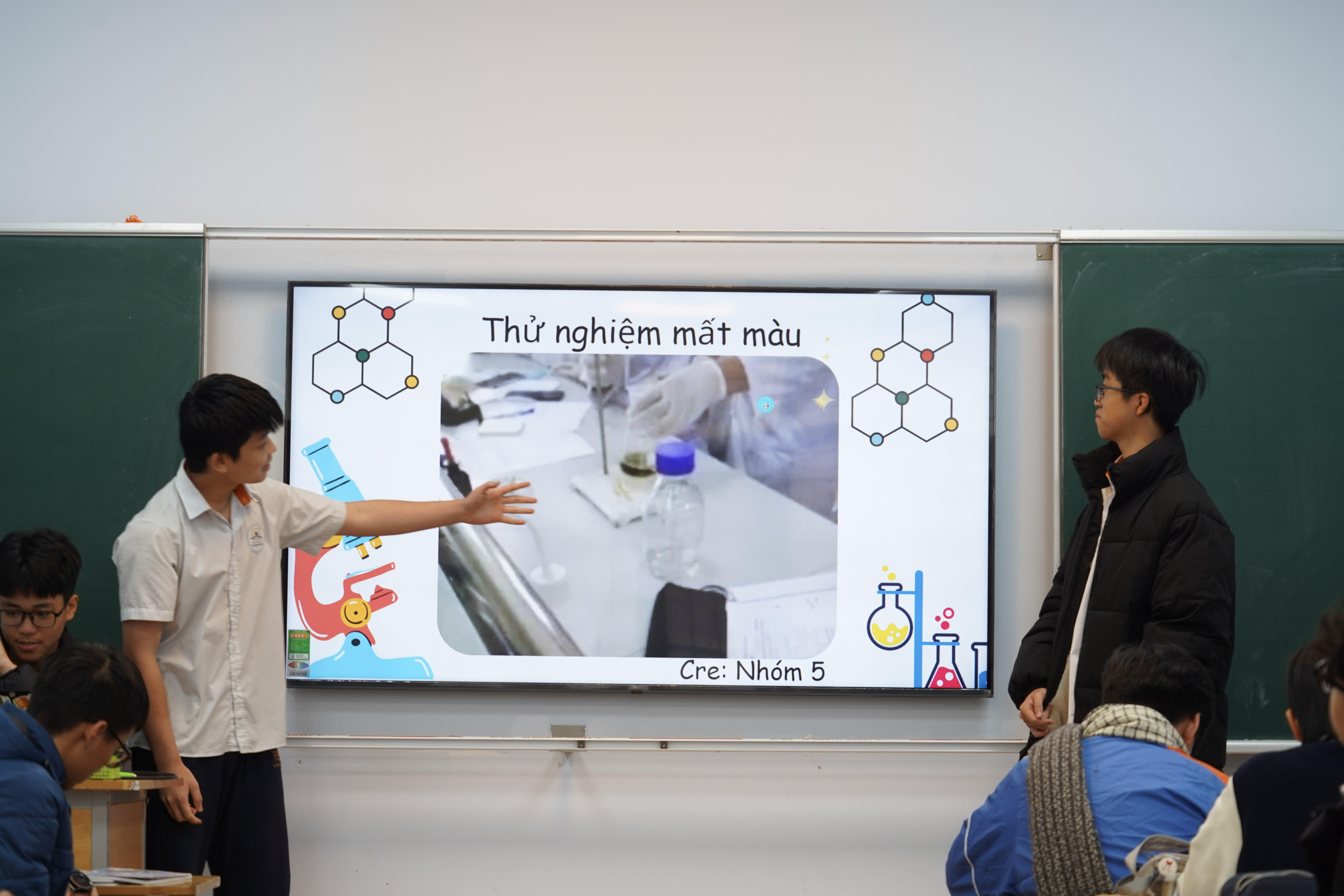 Trong hai tiết học, các nhóm học sinh lần lượt báo cáo trước lớp theo các nội dung được giáo viên hướng dẫn. Mỗi phần trình bày kéo dài khoảng 10 phút, tập trung làm rõ cơ sở khoa học của phương pháp, những khó khăn trong quá trình thực hiện và mức độ đáp ứng các tiêu chí đánh giá sản phẩm. Không dừng lại ở việc trình bày, các nhóm còn lại được yêu cầu tham gia phản biện với ít nhất một ý kiến nhận xét, câu hỏi hoặc bình luận cho mỗi phần báo cáo. Những trao đổi xoay quanh hiệu suất phản ứng, độ an toàn của quá trình điện phân, khả năng kiểm soát sản phẩm và tính ứng dụng thực tiễn của nước Javen thu được.