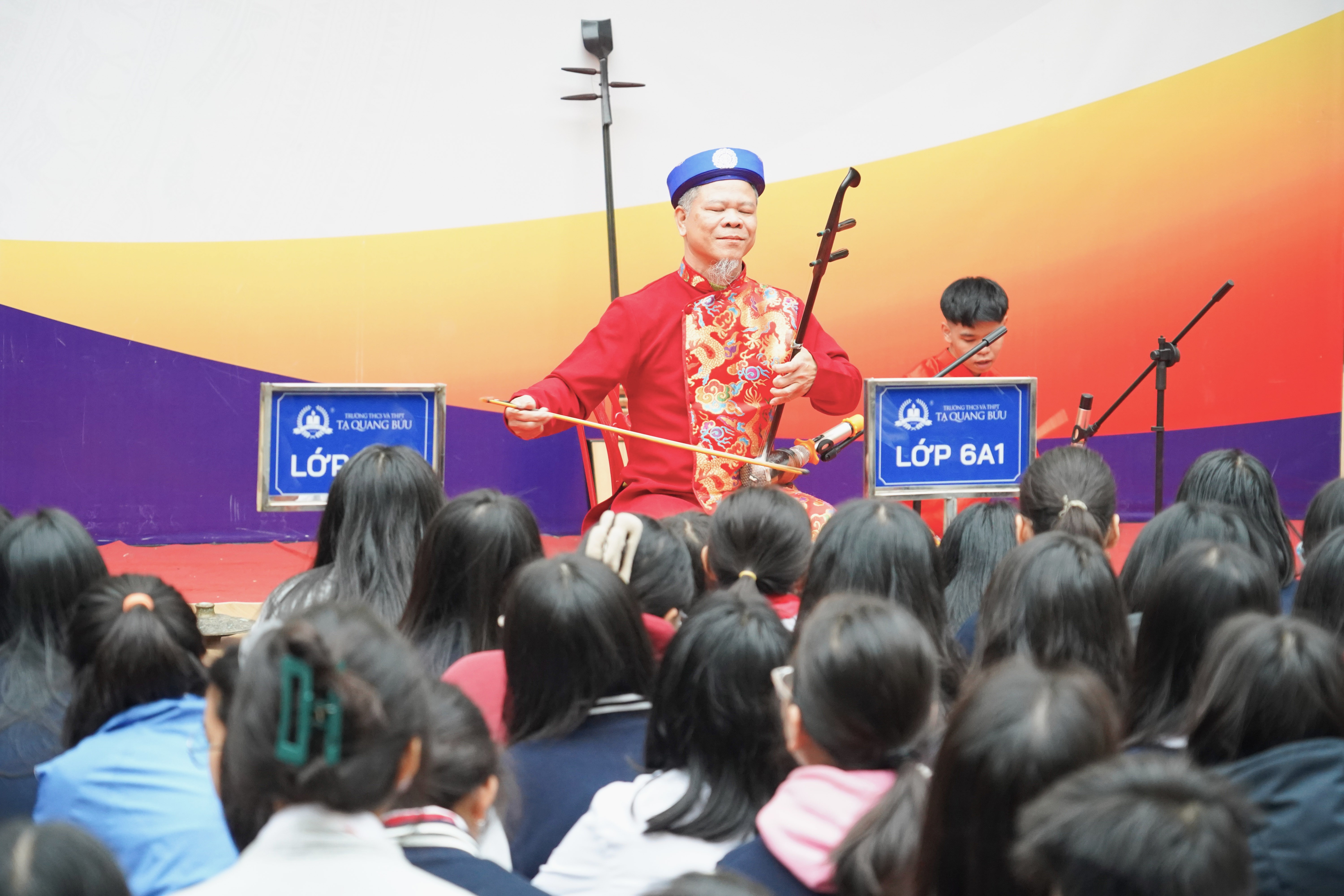 Thầy và trò Tạ Quang Bửu đã có dịp giao lưu, tìm hiểu về Nghệ thuật truyền thống Xẩm - Ca trù qua chương trình do Trung tâm Bảo tồn và Phát triển Nghệ thuật Sân khấu phối hợp tổ chức. Mở đầu là những làn điệu Xẩm mộc mạc mà sâu lắng qua phần trình diễn của NS Minh Thư và Minh Hằng, tiếp nối là phần thuyết trình giới thiệu tổng quan về nghệ thuật Xẩm do Thạc sĩ - NSƯT Hồng Hà trình bày, giúp học sinh hiểu thêm về lịch sử, giá trị và ý nghĩa nhân văn của loại hình nghệ thuật dân gian độc đáo này.