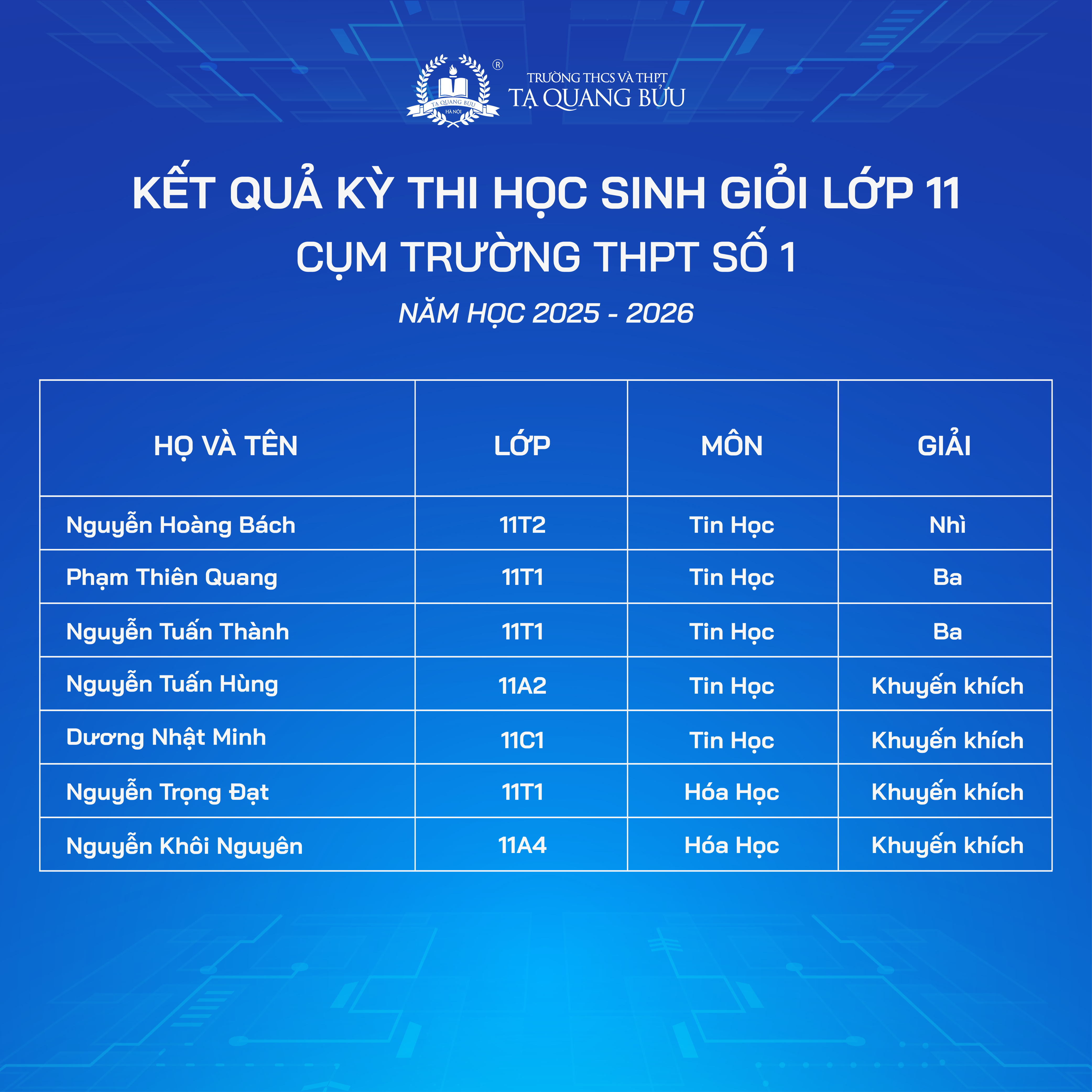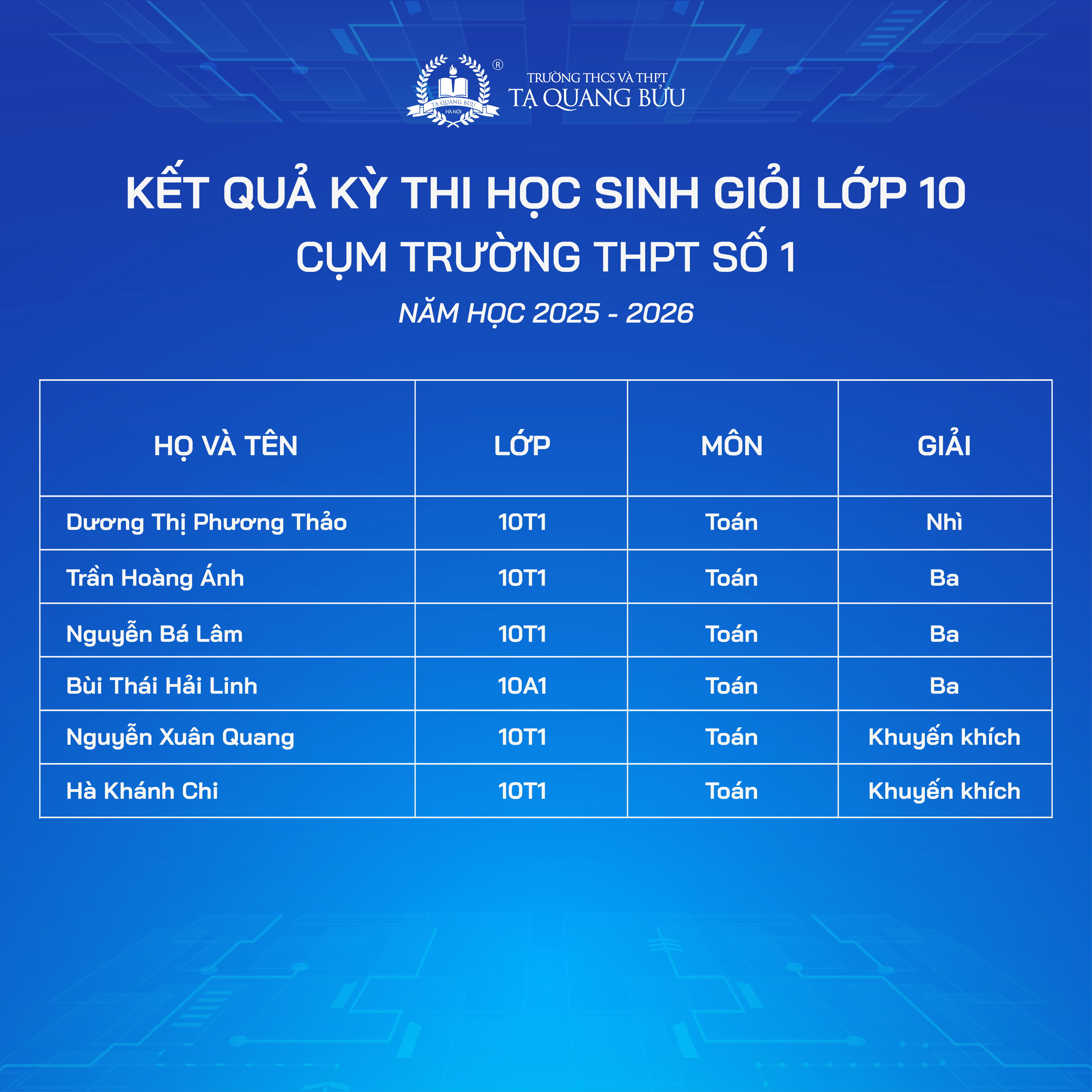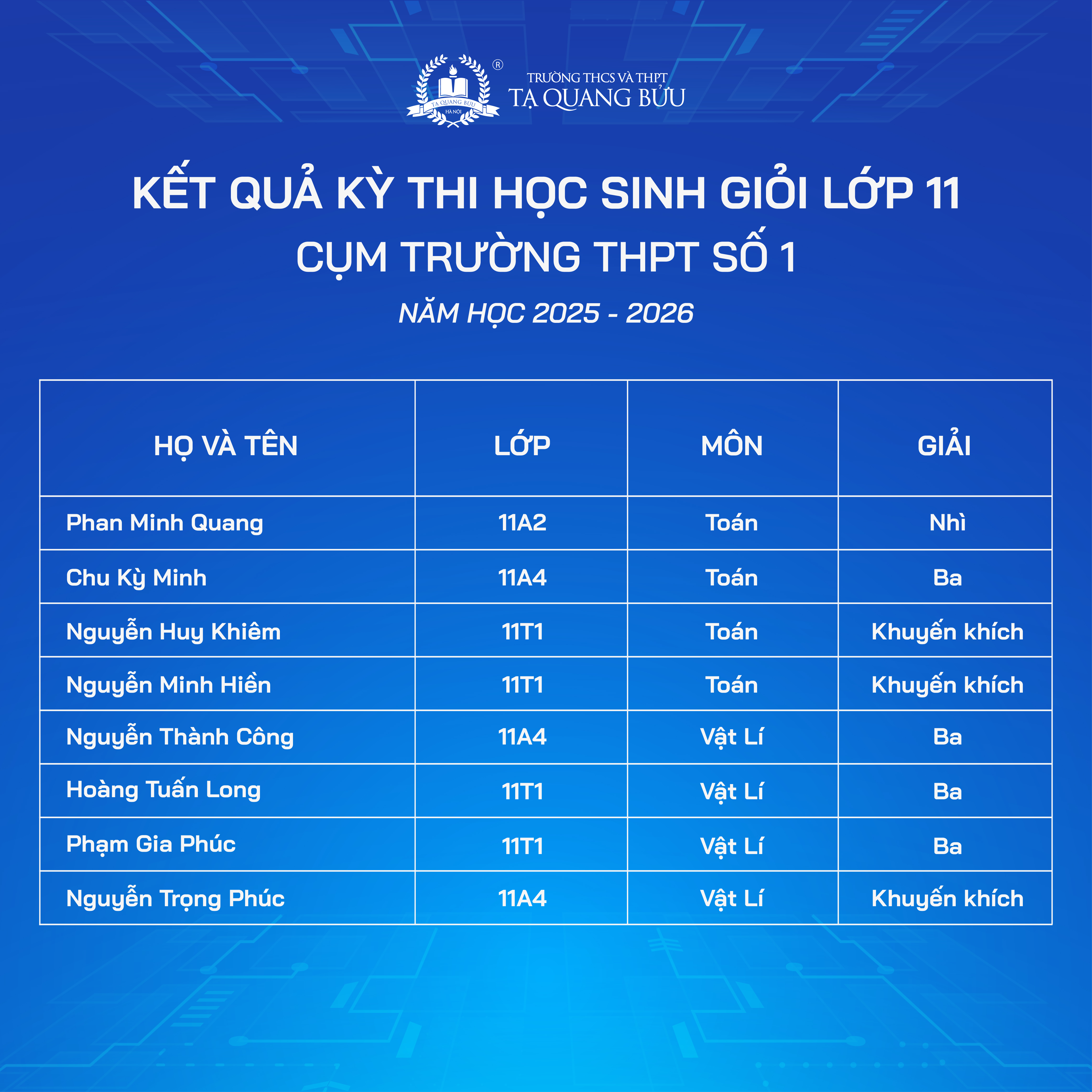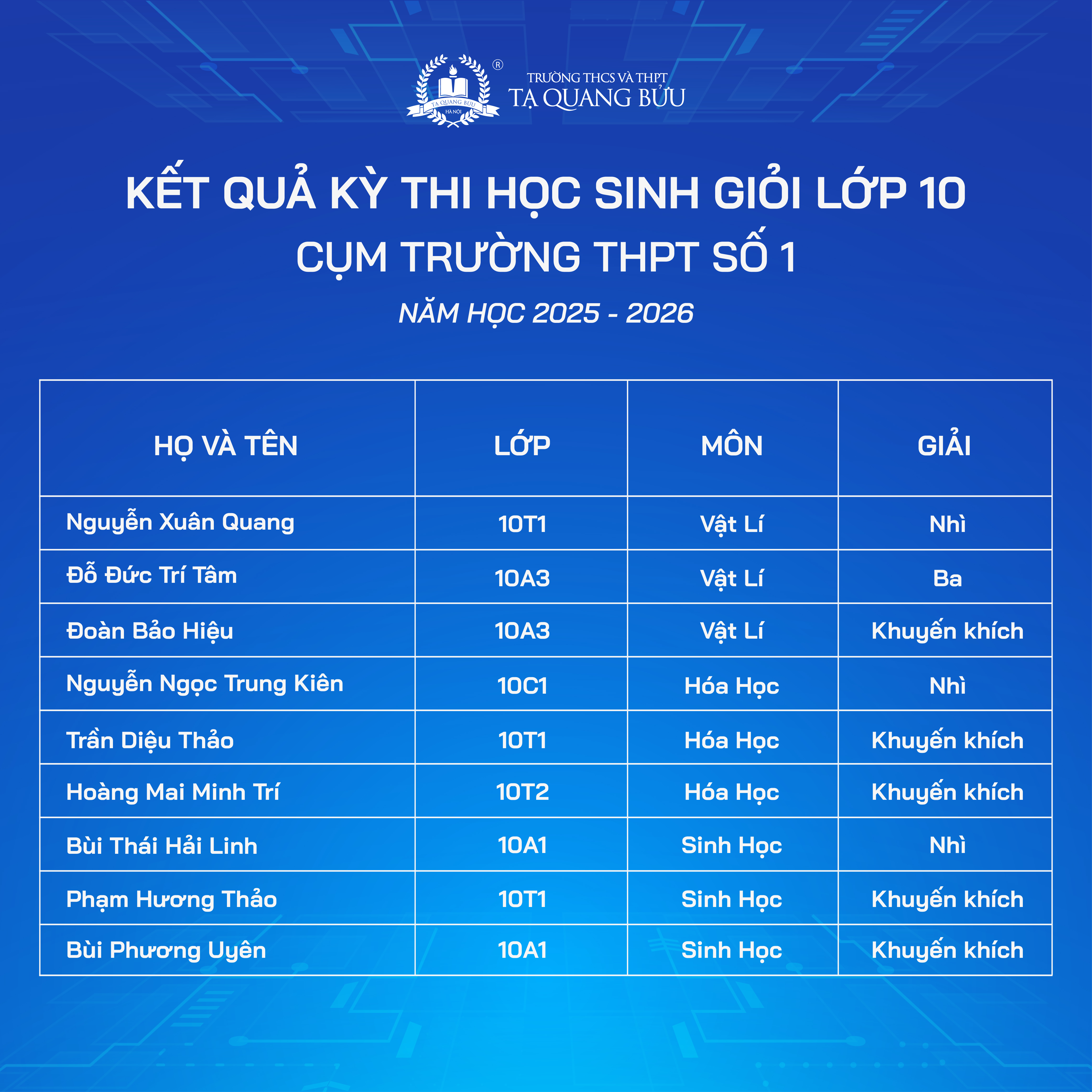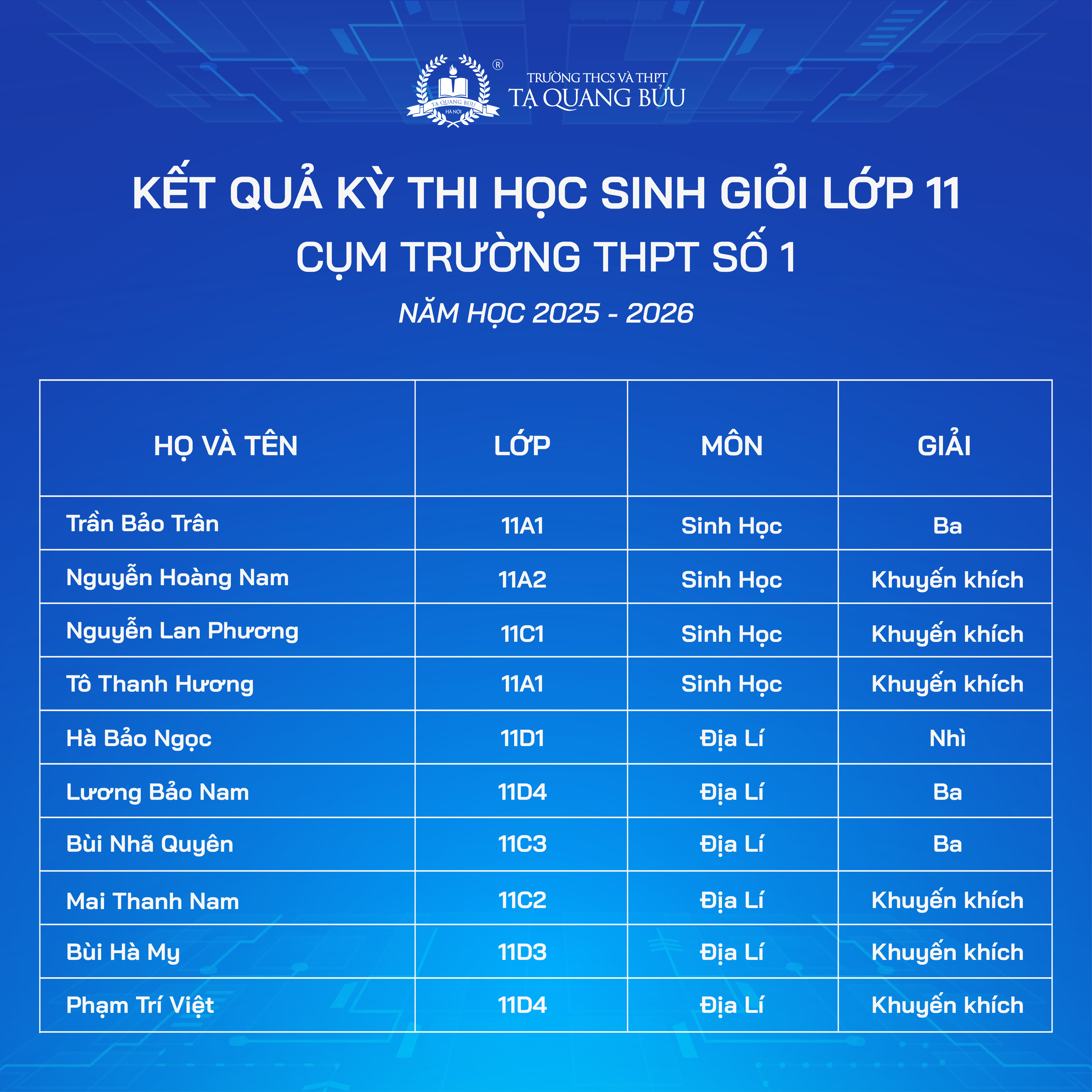 Trường THCS và THPT Tạ Quang Bửu xin chúc mừng các em học sinh đã đạt thành tích ấn tượng tại Kỳ thi chọn Học sinh giỏi các môn văn hóa lớp 10, 11 - Cụm trường THPT số 1 năm học 2025 - 2026.