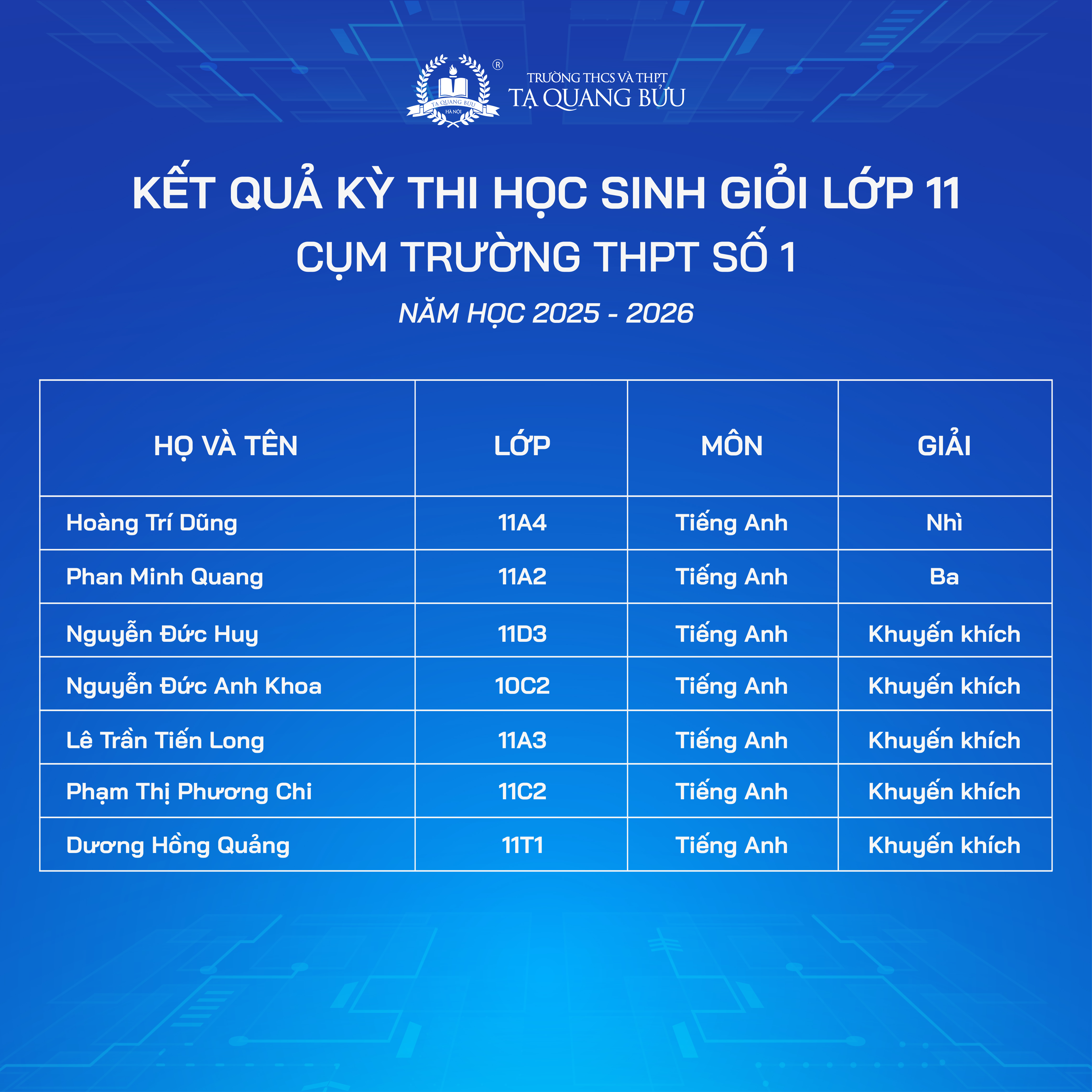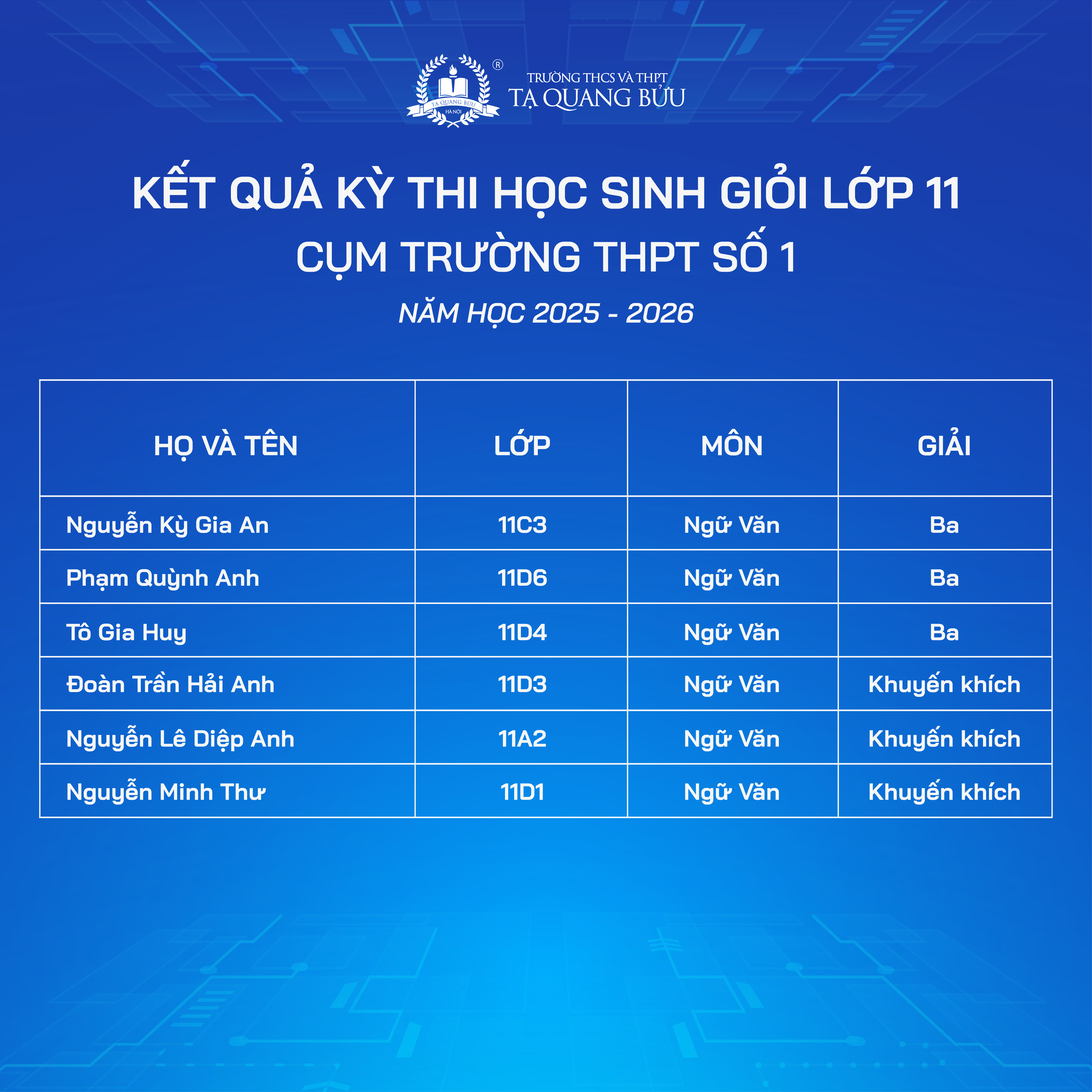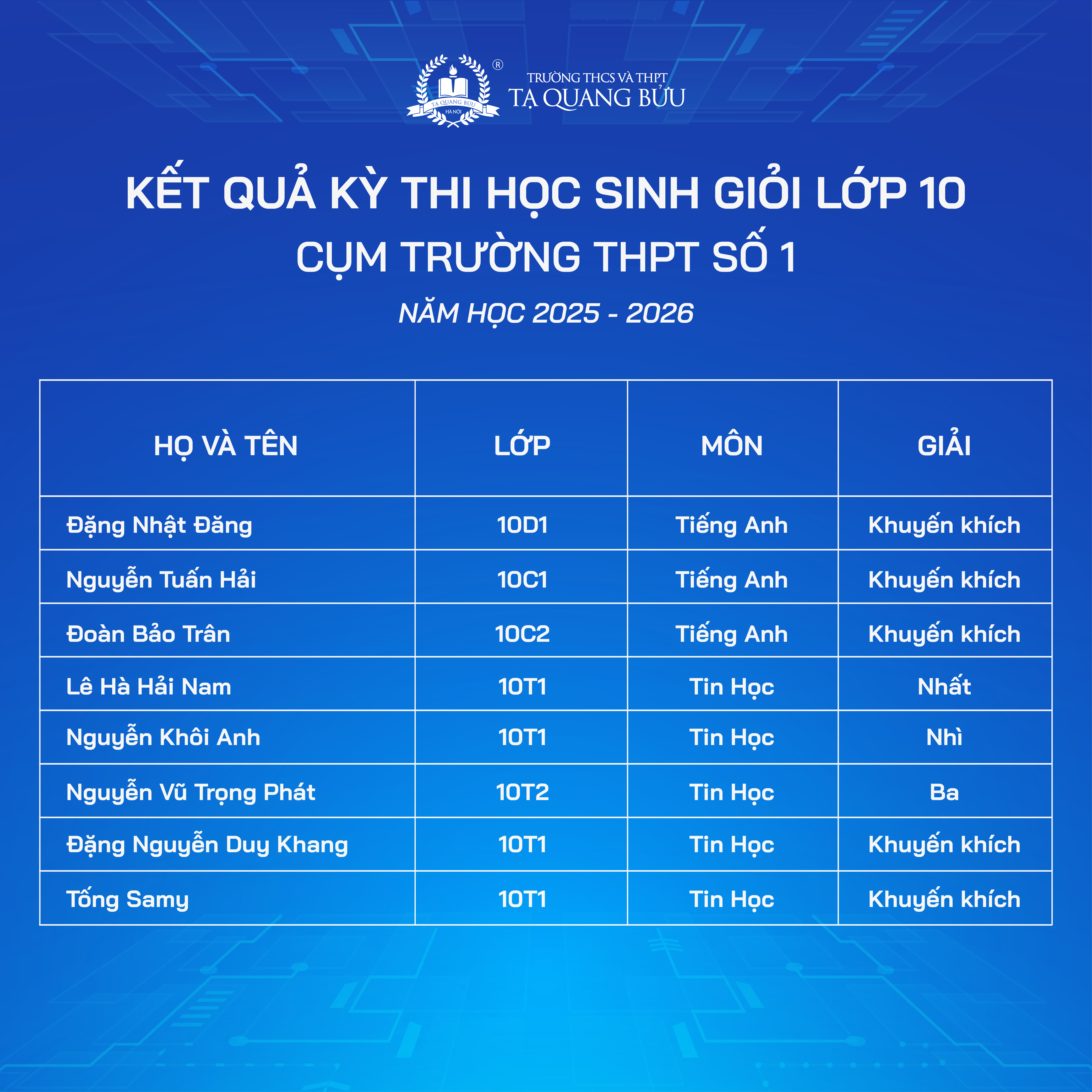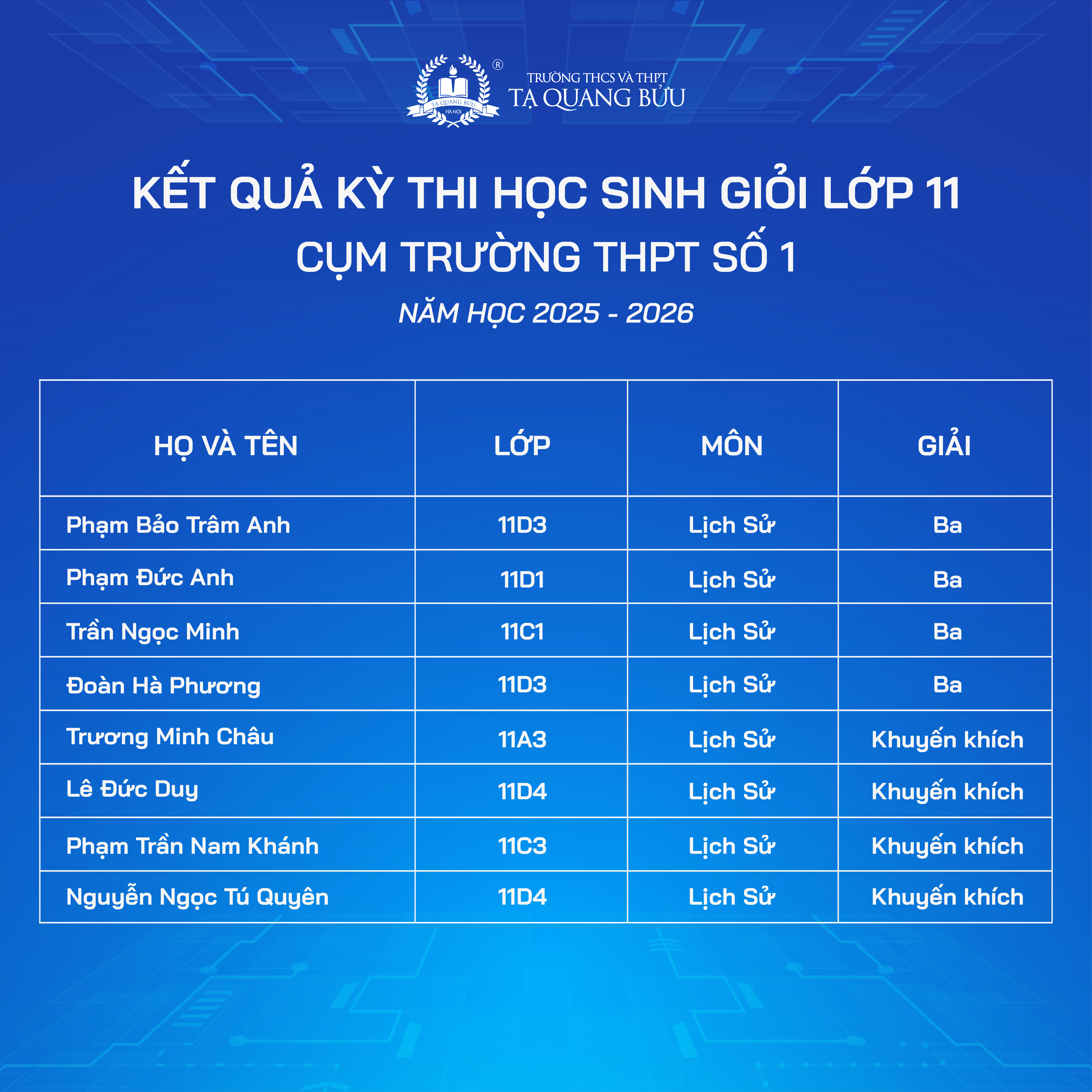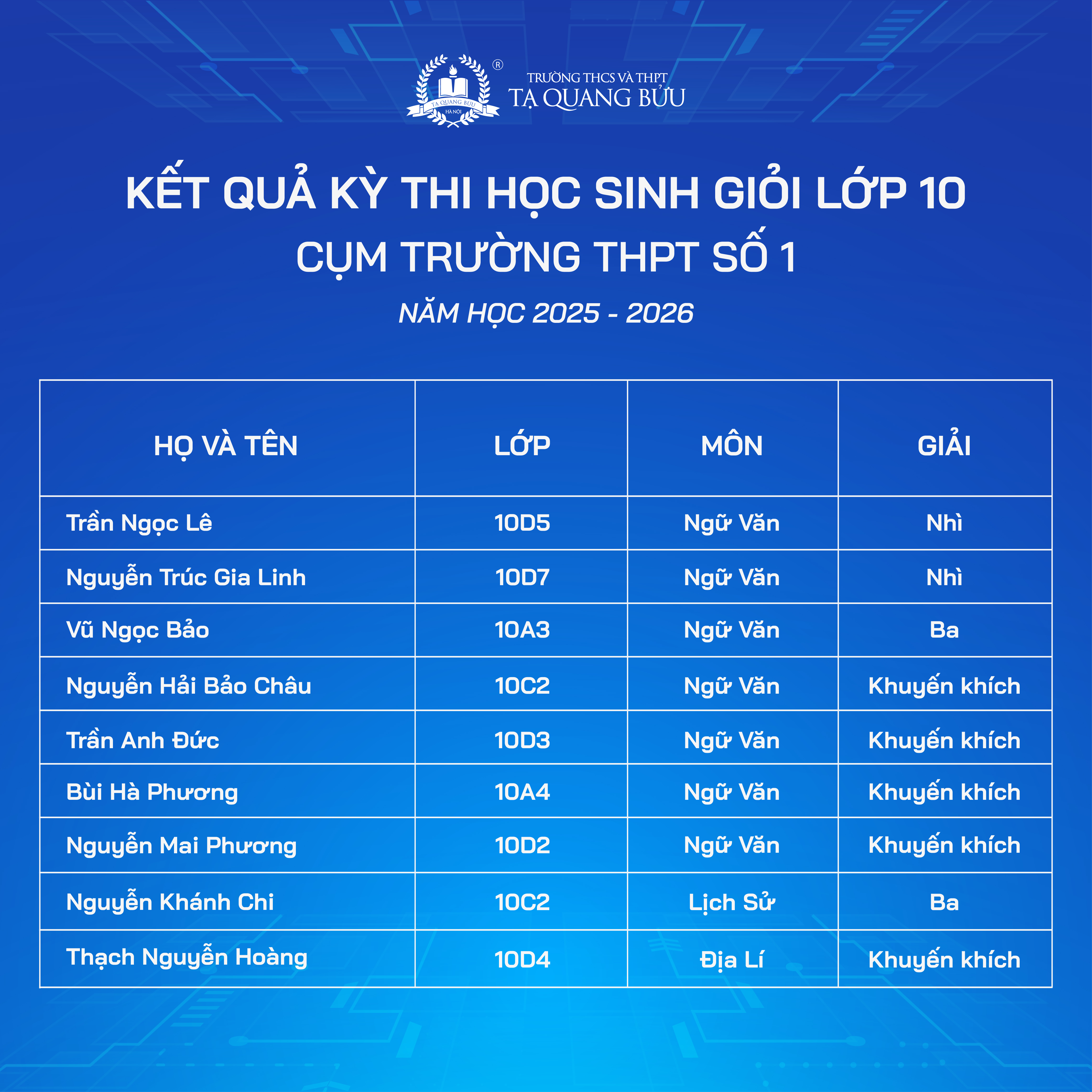 Trường THCS và THPT Tạ Quang Bửu xin chúc mừng các em học sinh đã đạt thành tích ấn tượng tại Kỳ thi chọn Học sinh giỏi các môn văn hóa lớp 10, 11 - Cụm trường THPT số 1 năm học 2025 - 2026.