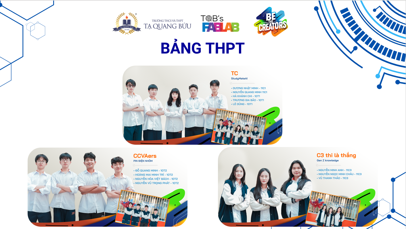 Xin trân trọng cảm ơn Ban Lãnh đạo nhà trường đã định hướng và tạo điều kiện để sân chơi sáng tạo được triển khai bài bản; cảm ơn các thầy cô mentor đã đồng hành sát sao cùng học sinh trong suốt quá trình phát triển dự án. Nhà trường cũng gửi lời tri ân tới Hội đồng Giám khảo vì những góp ý chuyên môn sâu sắc và thực tế. Đặc biệt, cảm ơn tất cả các đội thi - những học sinh đã dám nghĩ, dám thử và dốc sức cho hành trình sáng tạo của mình.