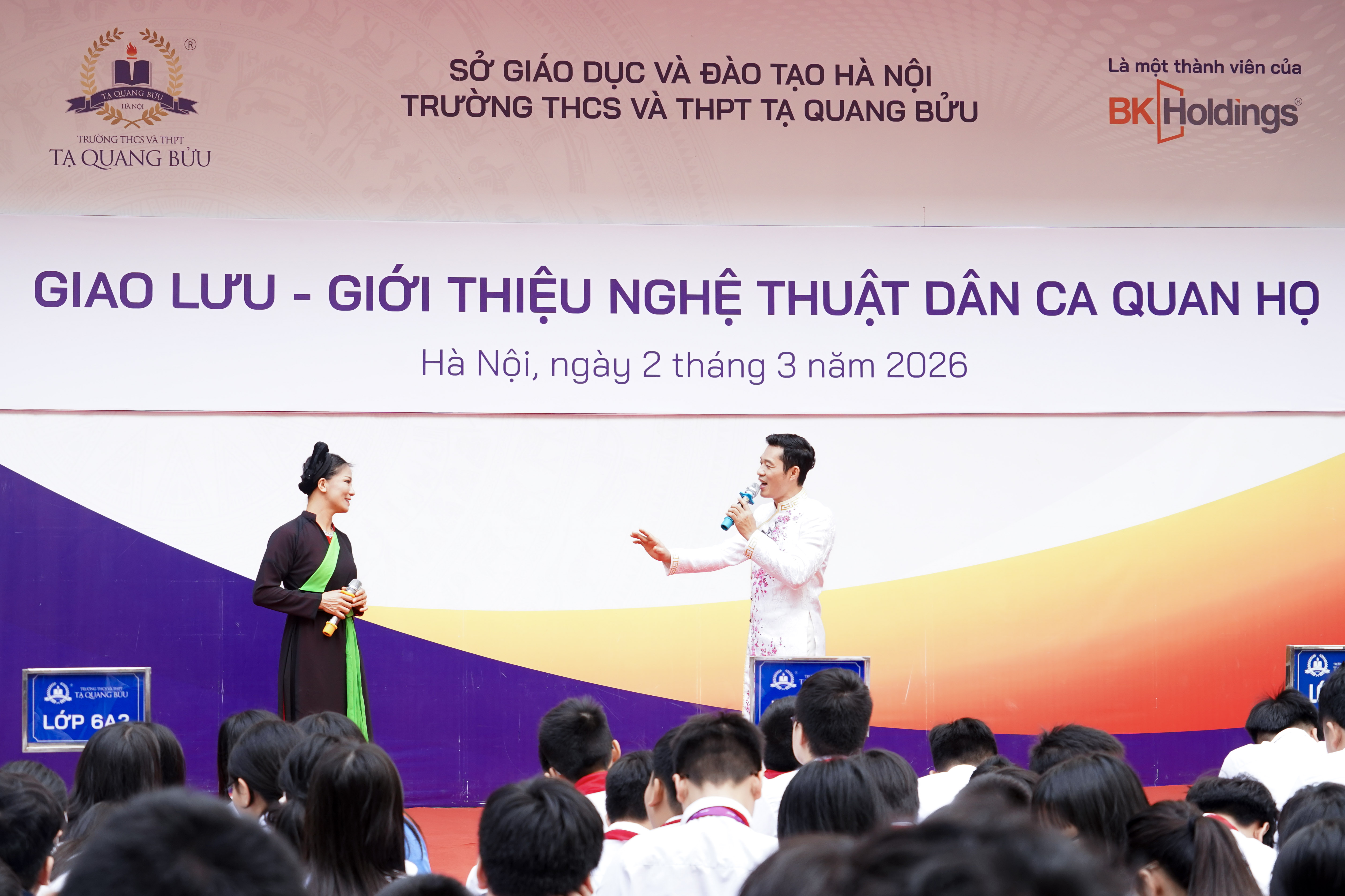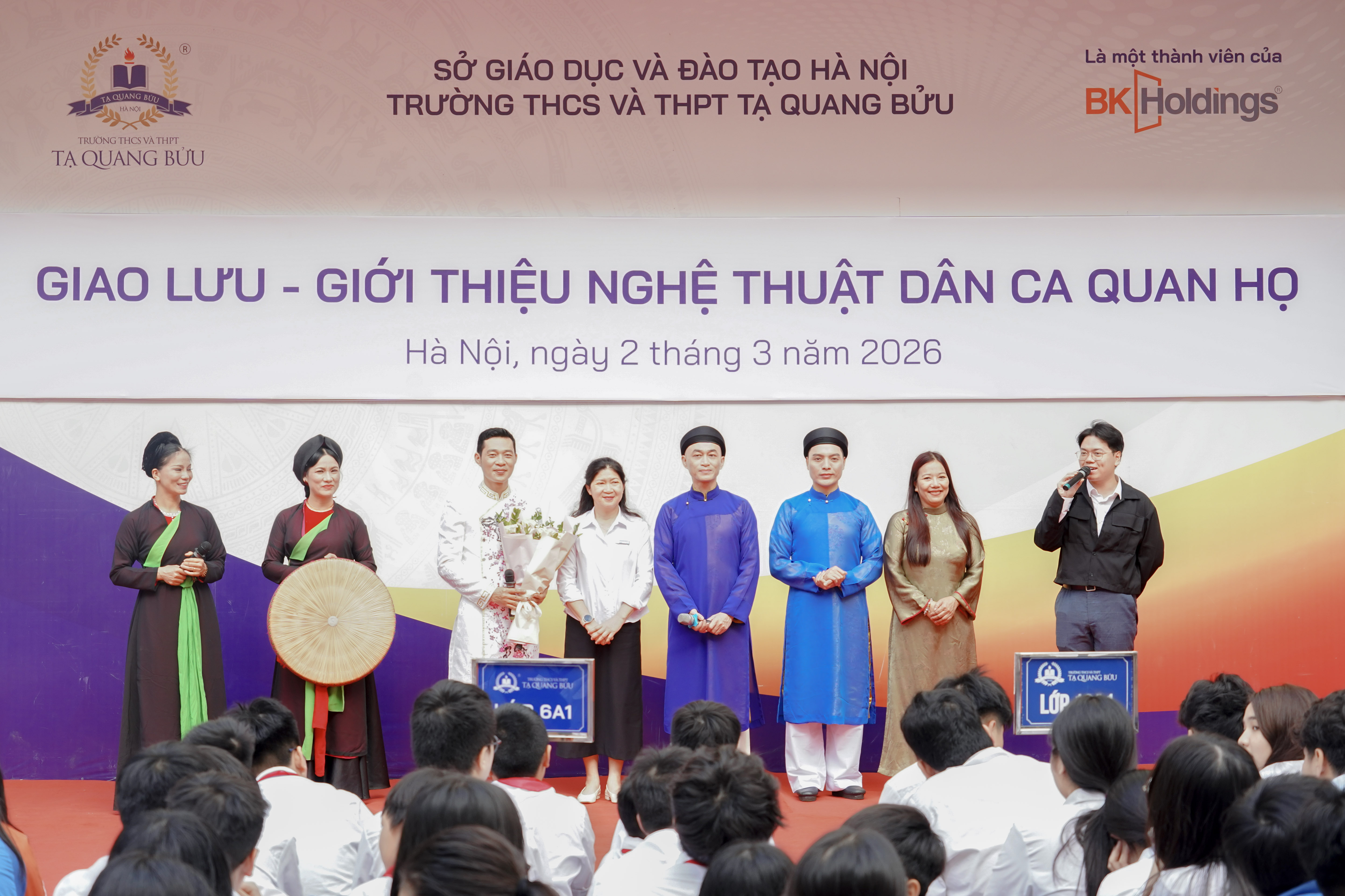 Buổi sinh hoạt dưới cờ sáng ngày 02/03/2026 tại Trường THCS và THPT Tạ Quang Bửu tiếp tục mang đến một không gian học tập đặc biệt, nơi học sinh được tiếp cận và trải nghiệm những giá trị văn hóa truyền thống giàu bản sắc dân tộc. Trong khuôn khổ chuỗi chương trình giao lưu nghệ thuật dân gian, giờ chào cờ đầu tuần đã trở thành một “lớp học văn hóa sống động”, đưa nghệ thuật dân ca Quan họ đến gần hơn với thầy cô và học sinh nhà trường.