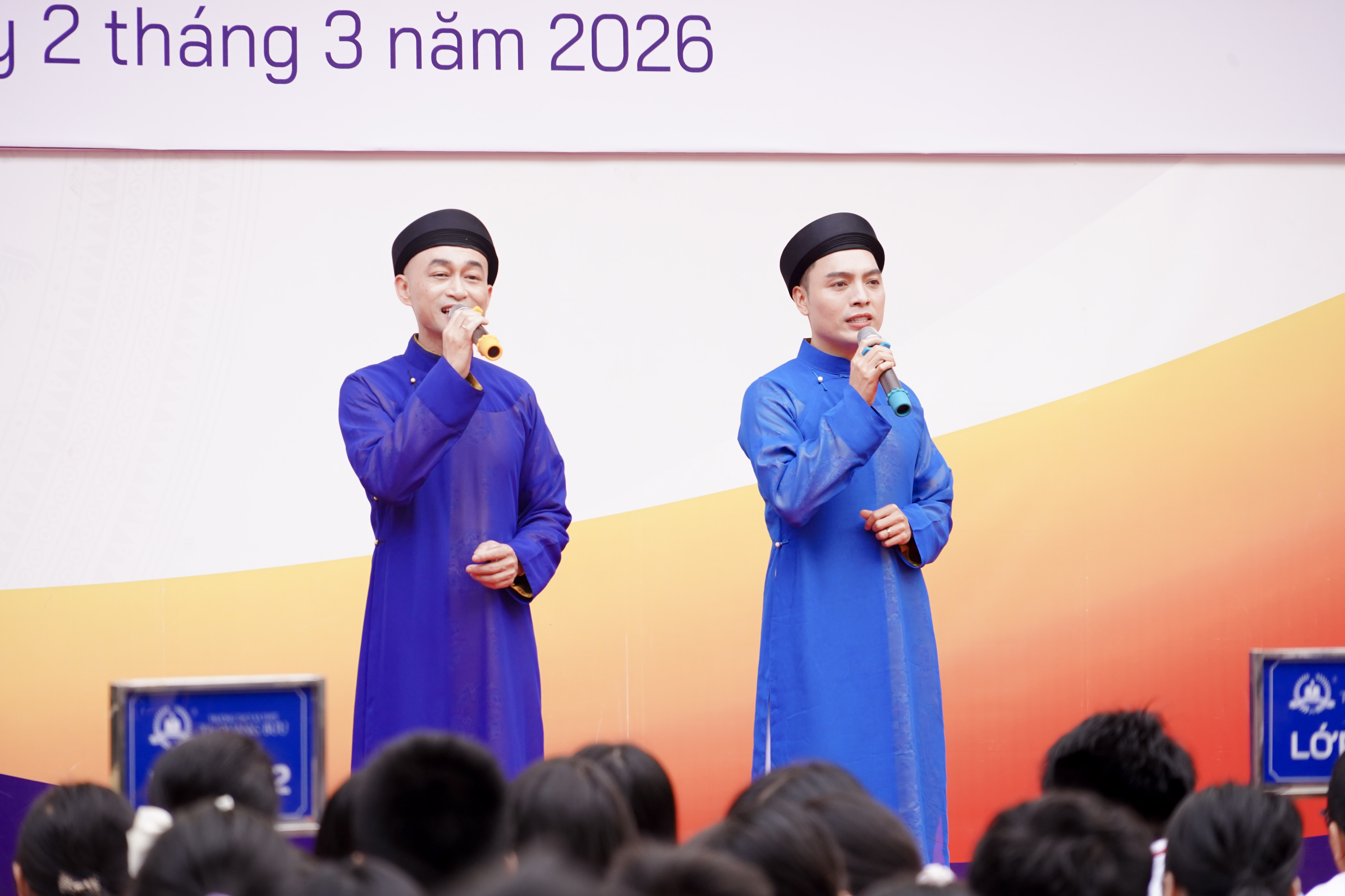 Chương trình mở đầu bằng làn điệu “Khách đến chơi nhà” do tốp nghệ sĩ Quan họ đến từ Trung tâm Bảo tồn và Phát triển Nghệ thuật Sân khấu biểu diễn. Những giai điệu mượt mà, đằm thắm vang lên trong không gian sân trường đã nhanh chóng tạo nên bầu không khí trang trọng mà gần gũi, đưa thầy cô và học sinh bước vào thế giới nghệ thuật dân gian đặc trưng của vùng Kinh Bắc.