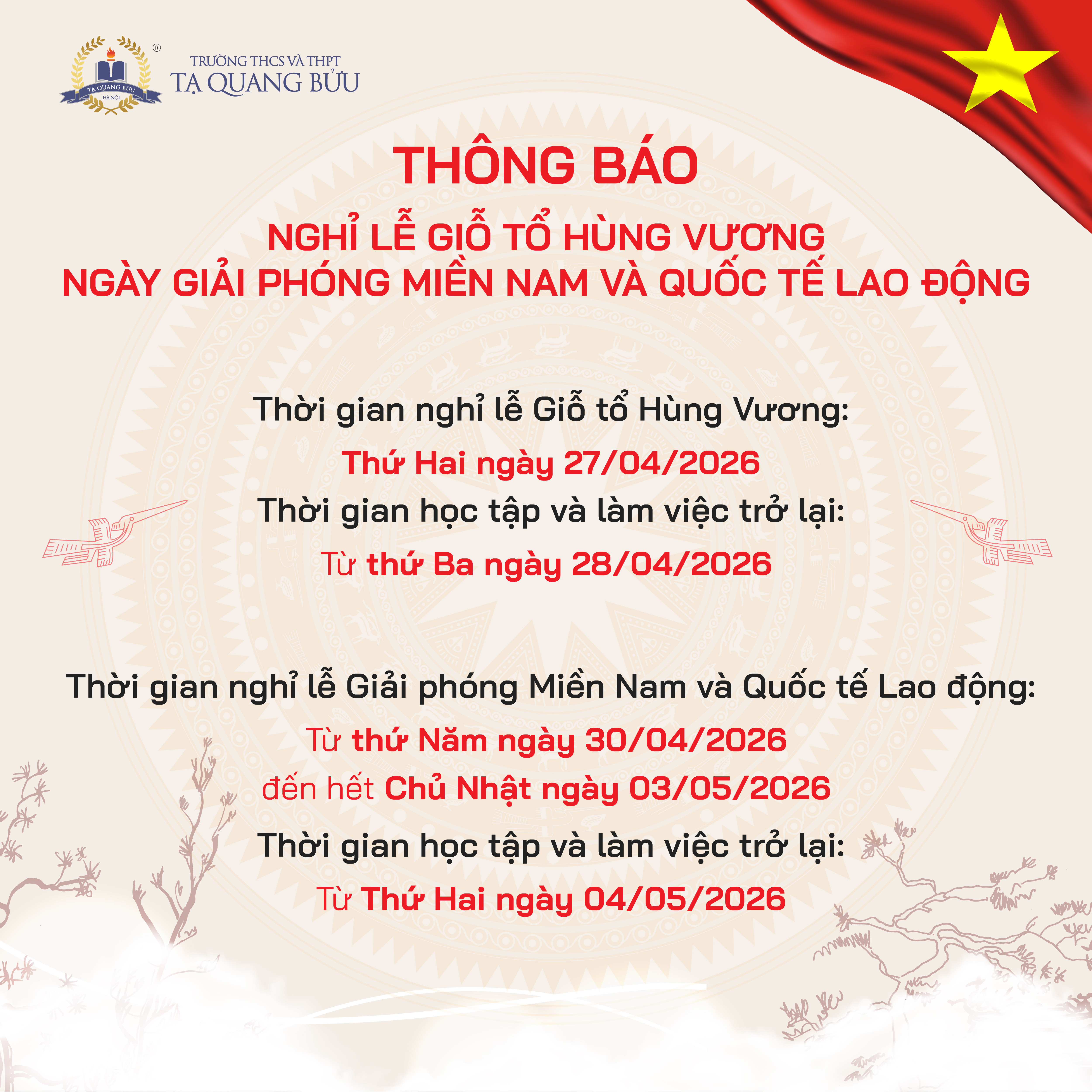 Trường THCS và THPT Tạ Quang Bửu trân trọng thông báo tới Quý phụ huynh và các em học sinh kế hoạch nghỉ lễ như sau: