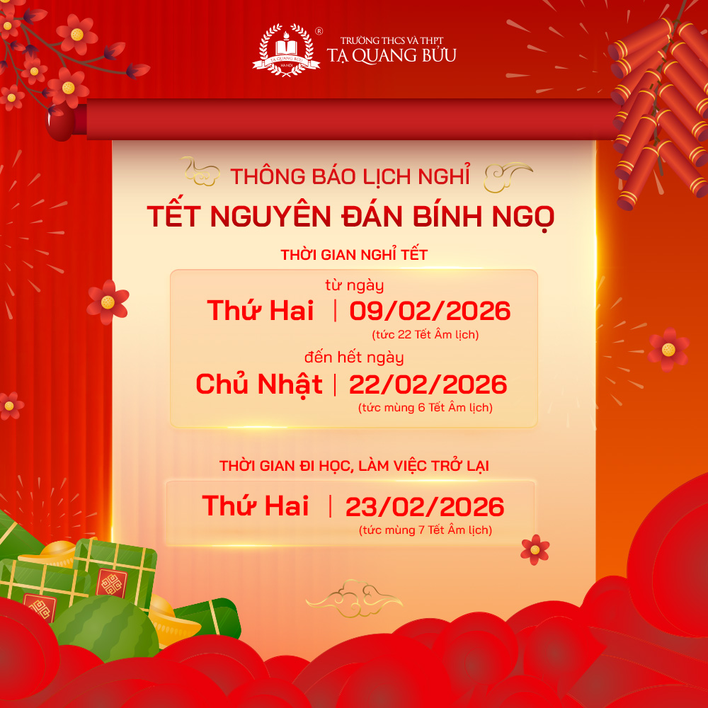 Theo nhịp xuân sang đón chào năm mới, Trường THCS và THPT Tạ Quang Bửu thông báo tới Quý phụ huynh, học sinh kế hoạch nghỉ Tết Nguyên đán Bính Ngọ năm 2026 như sau: