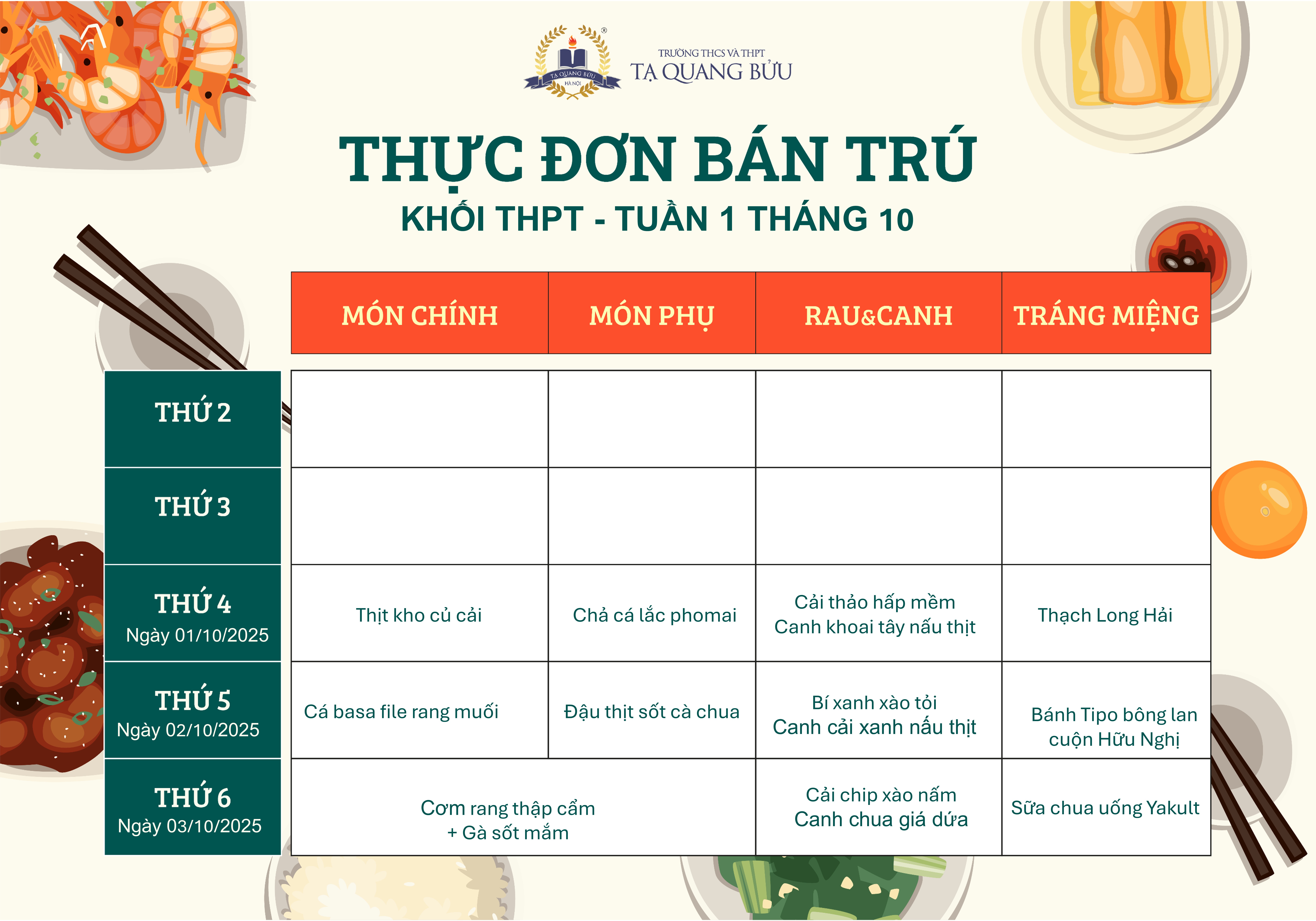 Theo kế hoạch tổ chức bán trú, Trường THCS và THPT Tạ Quang Bửu thông tin về việc sắp xếp thực đơn bán trú tháng 10/2025 với hai khối THCS và THPT.