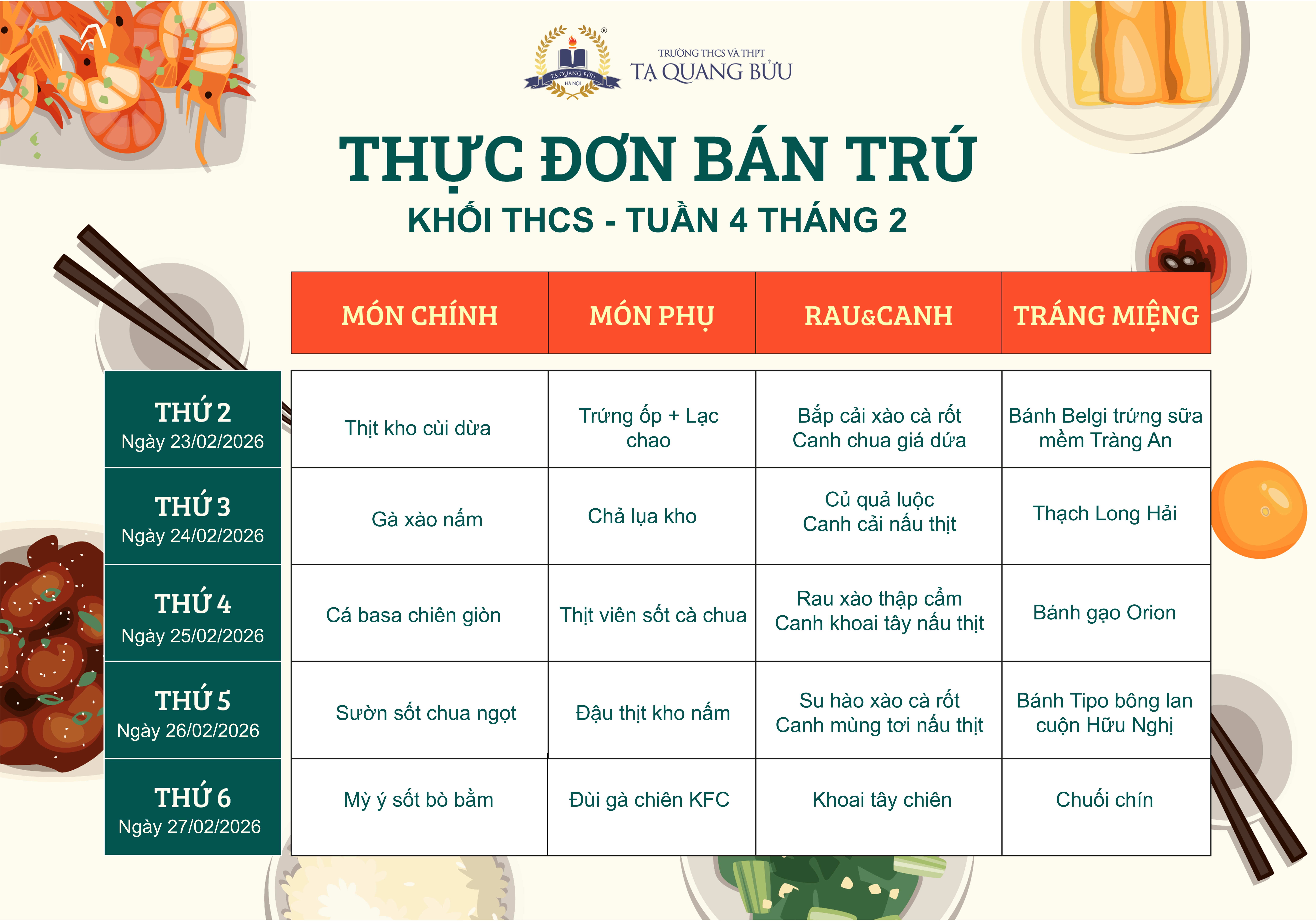 Theo kế hoạch tổ chức bán trú, Trường THCS và THPT Tạ Quang Bửu thông tin về việc sắp xếp thực đơn bán trú tháng 2/2026 với hai khối THCS và THPT.