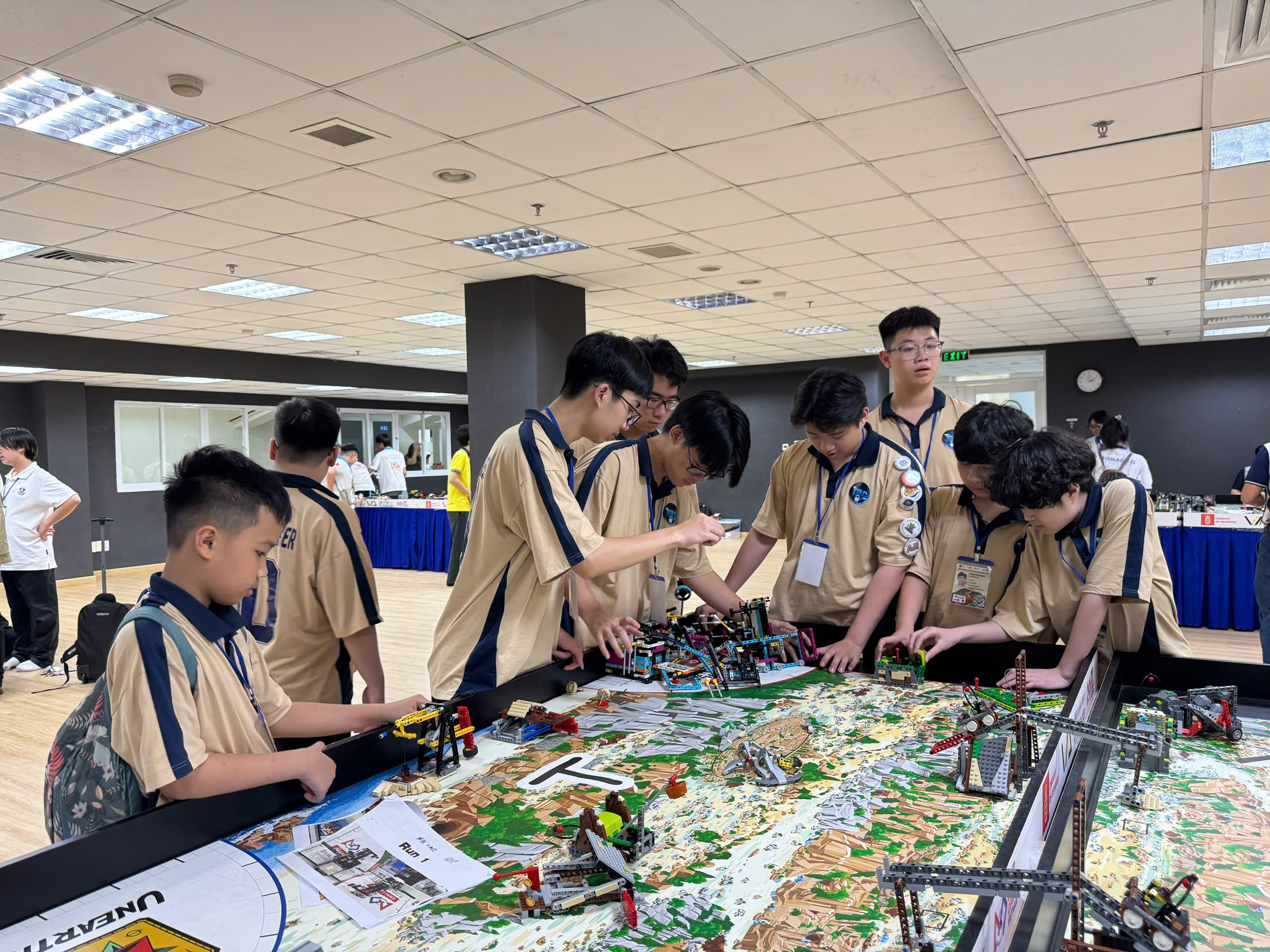 Trong hai ngày thi đấu, đội tuyển TQB Robot Makers đã hoàn thành đầy đủ các nội dung quan trọng của cuộc thi, bao gồm phần thi thuyết trình dự án, phần thi Robot Game và các hoạt động giao lưu, kết nối với các đội bạn. Ở ngày thi đầu tiên, các thành viên đã thể hiện sự chuẩn bị kỹ lưỡng trong phần thuyết trình, tự tin trình bày ý tưởng, đồng thời chủ động giao lưu, học hỏi từ bạn bè quốc tế. Sang ngày thi thứ hai, đội tuyển bước vào phần thi Robot Game với tinh thần tập trung cao độ, phối hợp nhịp nhàng trong từng lượt thi và bình tĩnh xử lý các thử thách trên sân đấu.