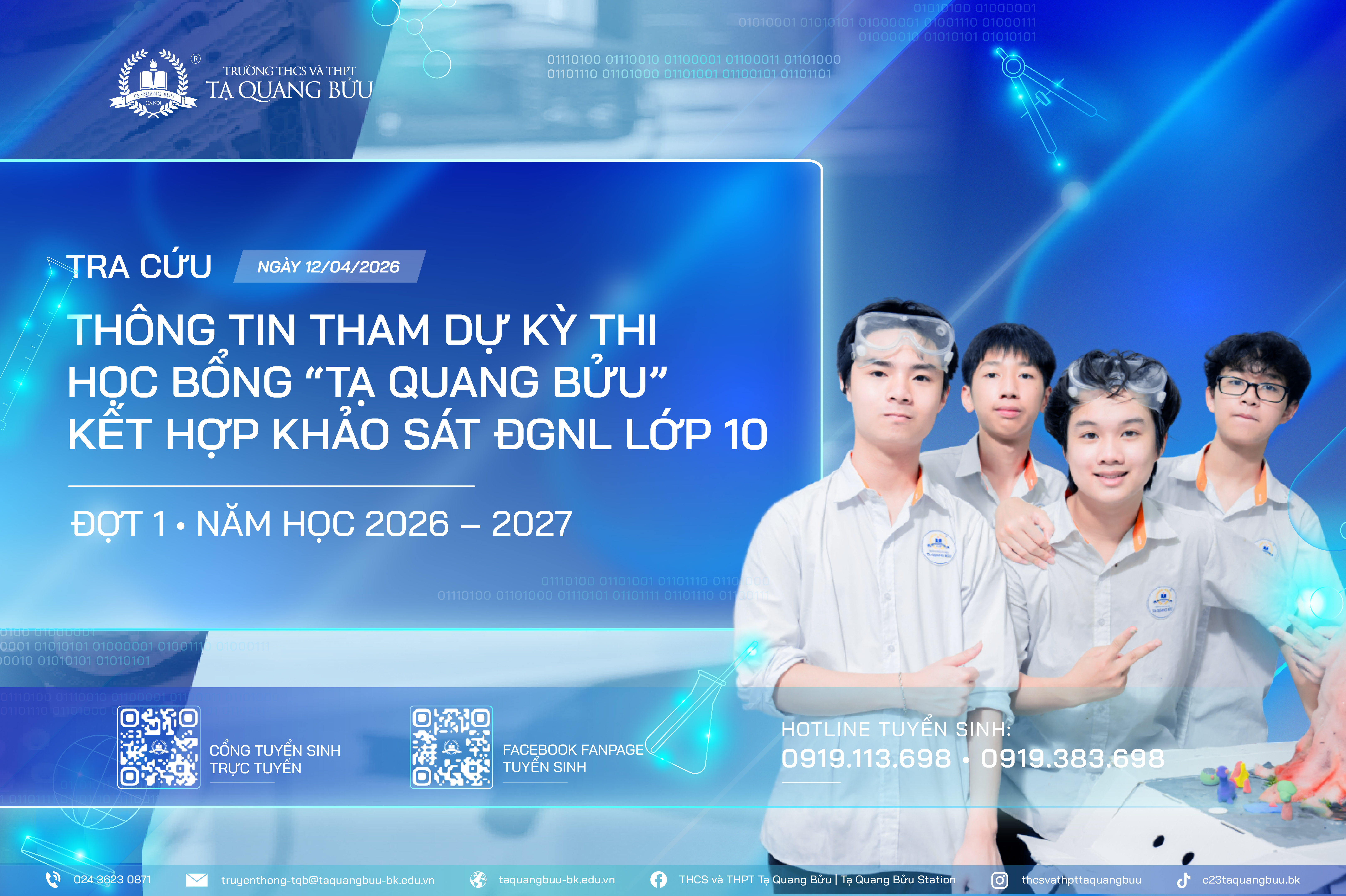 Học sinh mở hồ sơ có nguyện vọng đăng ký dự tuyển hệ tiên tiến đã có thể tra cứu số báo danh và các thông tin tham dự Kỳ khảo sát Đánh giá năng lực (ĐGNL) hệ tiên tiến lớp 10 năm học 2026 - 2027 diễn ra đợt 1 ngày 12/04/2026 tại Cổng tuyển sinh trực tuyến chọn mục 'TRA SOÁT KỲ KHẢO SÁT ĐGNL '.