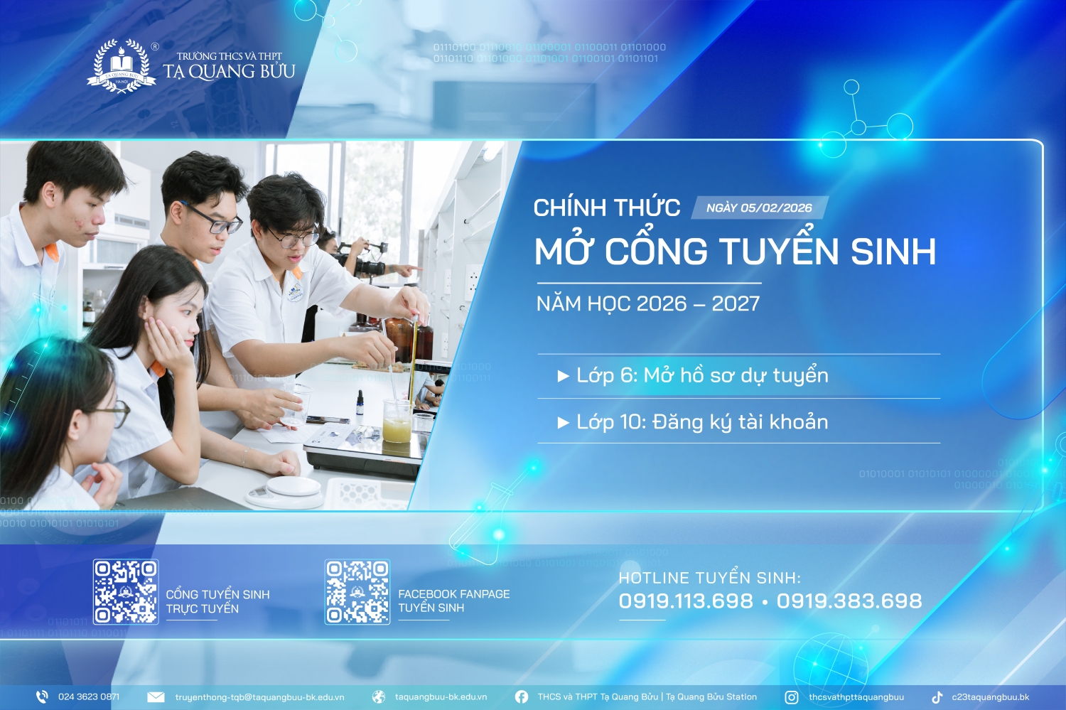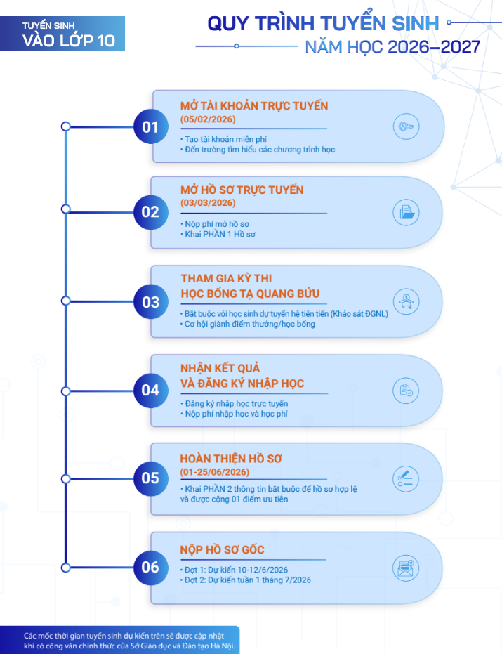 Trường THCS và THPT Tạ Quang Bửu thông báo chính thức đăng tải các thông tin tuyển sinh vào lớp 6 và lớp 10 năm học 2026 - 2027 trên Cổng tuyển sinh trực tuyến tại địa chỉ tuyensinh.taquangbuu-bk.edu.vn vào 8h00 ngày 05/02/2026.