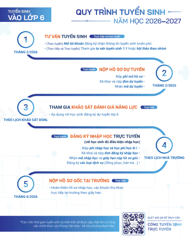 Bên cạnh Cổng tuyển sinh trực tuyến, các thông tin chính thức về tuyển sinh lớp 6 và phát hành hồ sơ sẽ được thông báo qua Website và Facebook Fanpage chính thức của Nhà trường. Quý phụ huynh, học sinh vui lòng theo dõi để chủ động cập nhật thông tin sớm nhất.